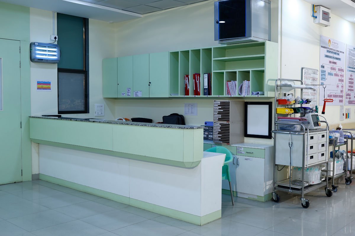 This department has been strategically located facing the main road at 356/A/2/A/5, Lt Atmaram Surve Marg, Kannamwar Nagar 1, Vikhroli East, Mumbai – 400 082). It facilitates the easy entry of an ambulance, and a suitable ramp has been provided to enter the spacious emergency department. The department has 8 beds fully equipped with life and limb-saving medical equipment and manned by a team of doctors around the clock. It has a dedicated examination room and also a room for doctors to counsel relatives of the sick. There is a minor Operation Theatre also on the ground floor that caters to all minor surgical procedures required, such as treatment of gaping wounds, suturing of lacerated wounds, plaster application in fracture cases, and such like